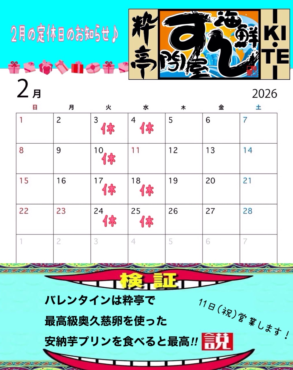 2月の定休日のお知らせ♪